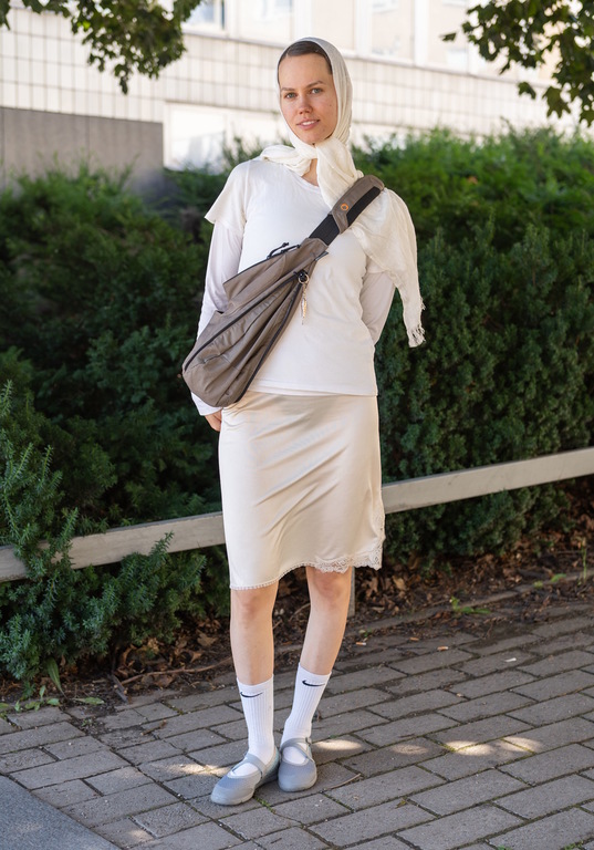“I’m wearing a vintage slip skirt, two white tops, a lace scarf, an old camera bag with a golden fish pendant, and grey ballerinas – every piece is second hand. I love the juxtaposition of minimal vintage pieces and playful accessorizing. At the moment I’m most inspired by clean silhouettes, objects found in nature and exploring the use of discarded items.”