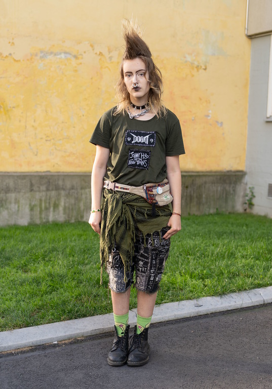 “I’m wearing my patch pants, a shirt I put some patches on, my hair up in a mohawk, and accessories. What inspires me: punks, my friends, maximalism. My goal is to look as weird as possible and I diy and thrift all my clothes.”