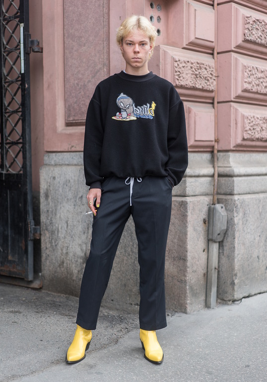 “I’m wearing a vintage Blind sweatshirt, cropped suit pants from Uff, and Calvin Klein 205w39nyc boots. Lately, I've been inspired by the late Soviet era rock. Turn on, tune in and cop out.”